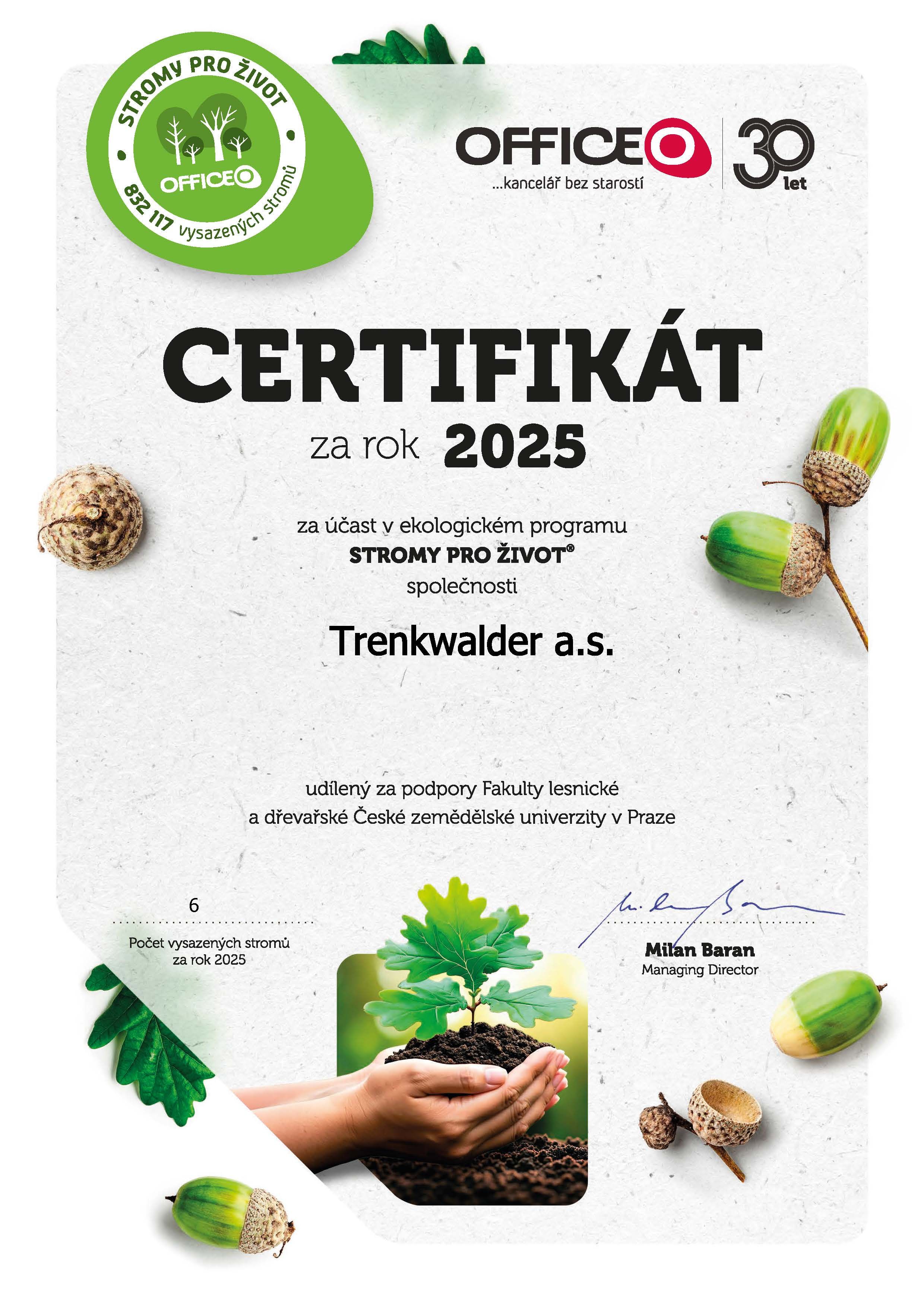Jsme součástí ekologického programu Stromy pro život® od společnosti Officeo, který podporuje obnovu českých lesů. V rámci tohoto projektu je za každých 50 odebraných balíků vybraného kancelářského papíru vysazen jeden strom. Program probíhá již od roku 2003 a díky němu bylo dosud vysazeno více než 832 000 stromů. Jsme rádi, že i my můžeme přispět k ochraně životního prostředí a obnově lesních ekosystémů.